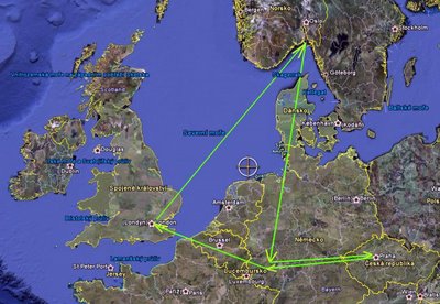 V neděli jsme se s hostelem definitivně rozloučili. Bohužel naše "snídaňárně" byla zavřená, tak jsme šli jet rovnou autem nakupovat. Nákup levného oblečení vyhrál před potravinami. Každý koupil něco teplého na sebe (přeci jen nás čekala za pár hodin cesta na sever) a mezitím nám vyhládlo. Došli jsme tedy do Tesca pro jídlo na celý den a vydali jsme se k observatoři v Greenwich parku. Péťa zadal v navigaci Greenwich road a tak jsme jeli. Já řídil druhé auto. Měli jsme jet asi 3km, ale když jsme míjeli budovu parlamentu a za chvilku se otáčeli u Hyde parku, tušili jsme, že něco je špatně. Na jedné z mnoha křižovatek jsem ztratil Péťu a tak jsme se vydali ke Greenwich parku. Franta prokázal své zkušenosti s navigováním a nebýt zacpaných silnic, tak jsme u parku během pár minut. Prohlídli jsme observatoř, dali foto s nultým poledníkem, poté přijelo naše "první" auto, které dalo zkrácenou prohlídku. Z Greenwich jsme vyrazili do Cambridge. Ujeli jsme asi 10km a GPSka říkala že jsme na místě (byli jsme v Londýnské čtvrti Cambridge). Pěkné místo, to jo, ale Londýnské metro nás poněkud překvapilo. V rámci hledání záchodů jsme koukli na kousek kriketového utkaní a pokračovali tentokrát do univerzitního města Cambridge. Starobylé město, nacpané univerzitami všech vědních oborů. Procházka, focení a na konec zakončení v jedné ze studentských hospůdek. Dali jsme něco k pití a vydali se na letiště Stansted. Tam Franta s Petrem vrátili auta bez problému (i když to naše bylo nepěkně potřísněno holubím trusem) a všichni jsme se vydali zabrat klidné místo ke spánku někde v koutě letištního terminálu. Pondělí, půl páté ráno budíček. Vyčisti zuby, uklidit po sobě a hurá k bezpečnostní kontrole. Poté nás vláček odvezl ke Gate. Letadlo mělo trochu zpoždění, tak jsme všichni usnuli ještě na zemi. Zdálo se to jako chvíle, ale venku už bylo pěkně teplo a my přistávali na letišti Oslo Torp v Norsku. První let za námi a do druhého nám chybělo asi 7 hodin. Neváhali jsme, sedli jsme na vlak a jeli do přímořského města Sandefjord. Dali jsme procházku a piknik u moře. Cestou zpět jsme ve vlaku "utíkali" před průvodčím, ale těsně před výstupem nás dostihl. Franta vytáhl platební kartu, kterou naštěstí terminál ve vlaku nepřijímal a tak nám paní průvodčí poměrně drahé jízdné odpustila. Opět krátké odbavení a už si to letíme do Německa na letiště Frankfurt Hahn. Máme asi hodinu do posledního (TŘETÍHO) letu, na chvilku vylézáme na vzduch, dojídáme poslední zbytky jídla, jdeme se naložit do letadla a už míříme domů do Prahy.