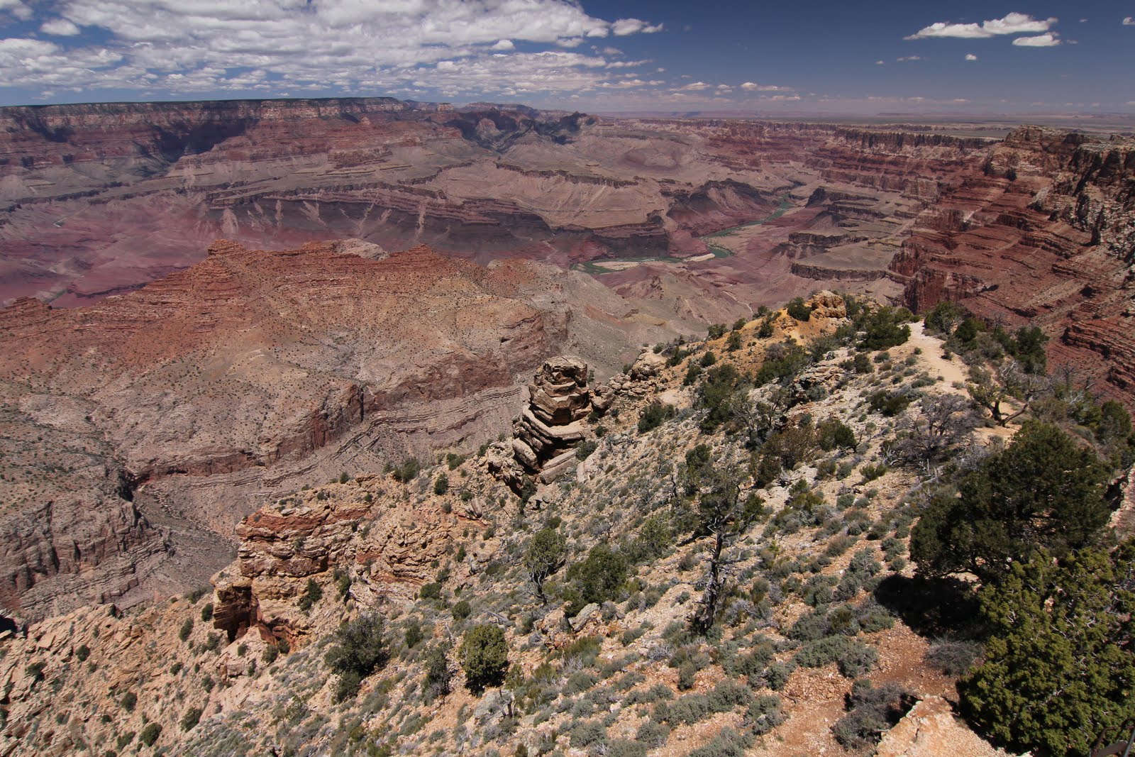 Na snídani jdeme s naším kamarádem, který tu byl jako lektor foto-expedice. Dostáváme moc zajímavé tipy kam a kdy se vypravit. Něco neuvěřitelného je Fremont Street, jak v noci tak ve dne. Toto je to původní Las Vegas a stojí za to sem na chvíli zajít. Nakupujeme zásoby na cestu a vyrážíme na jihovýchod (hlavně východ). Z nového dálničního mostu která spojuje Nevadu a Arizonu je úžasný pohled na přehradu Hoover Dam. Prohlídka nám zabírá několik hodin. Odtud jedeme až do Flagstaffu, kam přijíždíme zas za tmy, kus cesty jsme jeli trochu oklikou po legendární Route 66. Grand CanyonGrand Canyon NP (konkrétně jižní okraj) máme na programu další den. Moc nepospícháme, chceme spát v kempu a pokud nemáte rezervaci, tak je možné od 12 ulovit nerezervovaná místa, což se nám za 18$ daří. Příště jsme už chytřejší a místa rezervujeme s předstihem na http://www.recreation.gov. Děláme trek po South Kaibab trail do Skeleton point (1591 m, římsa kaňonu je 2200 m.n.m). Tímto trailem se dá dojít až na dno kaňonu (Češi to za den zvládnou, ale je to maso), což jsme v plánu neměli a stejně nás před tím všichni varovali. Květnová noc v kempu je díky nadmořské výšce 2200m pěkně chladivá. Další den jedeme podél okraje kaňonu, kde se s ním u Desert view loučíme. Dnes nás čeká Moab (až v noci)! Monument valley