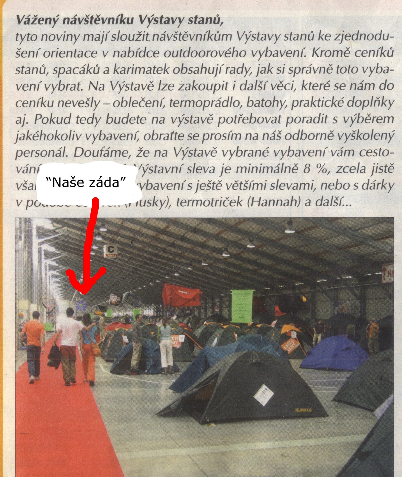 naštěstí ne ve zlém. Kdybych to na vlastní oči neviděl, tak nikomu nevěřím že je tak snadné si "zahrát" v reklamě. Ano moje a Zuzky ZÁDA jsou v reklamním letáku :-).Ptáte se jak na to? Popravdě nevím... Se Zuzkou jsme potřebovali koupit stan a prodejní výstava stavů v Letňanech pro to byla ideální příležitost. Strávili jsme tam asi 2 hodiny vybíráním (naštěstí ne ve frontě u pokladny) a odnesli si stan, prostě nic zvláštního.