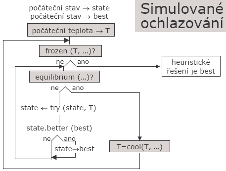 Z pokro�il�ch iterativn�ch metod jsem si vybral algoritmus simulovan� ochlazov�n�. Je pops�n "v�vojov�mi diagramy" na n�sleduj�c�ch obr�zc�ch.