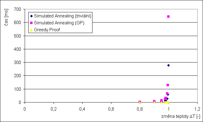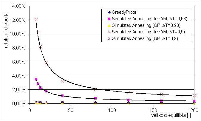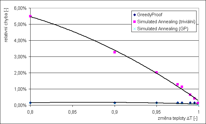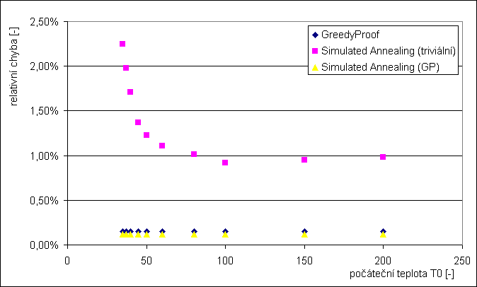 Algoritmus simulovan� ochlazov�n� je pom�rn� snadn� na implementaci. Z experiment� m��eme ��ct, �e je �asov� n�ro�n�j�� ne� hladov� algoritmus a p�i inicializaci trivi�ln� konfiguraci d�v� pr�m�rn� hor�� v�sledky. Pokud inicializujeme SA hodnotou z�skanou GP algoritmem, v pr�m�ru v�dy dojde ke zlep�en� relativn� chyby. Proto�e algoritmus si pomatuje nejlep�� �e�en�, nem��e nikdy vyj�t hor�� v�sledek ne� u GP.U tohoto algoritmu (stejn� jako u dynamick�ho programov�n�) dop�edu zn�me po�et iterac� cyklu, tud� m��eme odhadnout �asovou n�ro�nost. Proto je na prvn� pohled trochu divn�, ��dov� rozd�ln� �as p�i inicializaci trivi�ln�m �e�en�m a �e�en�m dodan�m GP algoritmem. Skryt� �asov� z�vislost je v generov�n� nov�ho stavu. Ten generujeme tak, �e zm�n�me bit na n�hodn� pozici v sou�asn� konfiguraci, ale v�sledn� konfigurace mus� b�t p��pustn�m �e�en�m. Proto pokud vyjdeme z trivi�ln� konfigurace je velk� pravd�podobnost, �e nov� stav vygenerujeme na 1. pokus. U ji� nalezen�ho �e�en� nap�. algoritmem GP opakujeme generov�n� pom�rn� dlouho, ne� dostaneme p��pustnou konfiguraci.