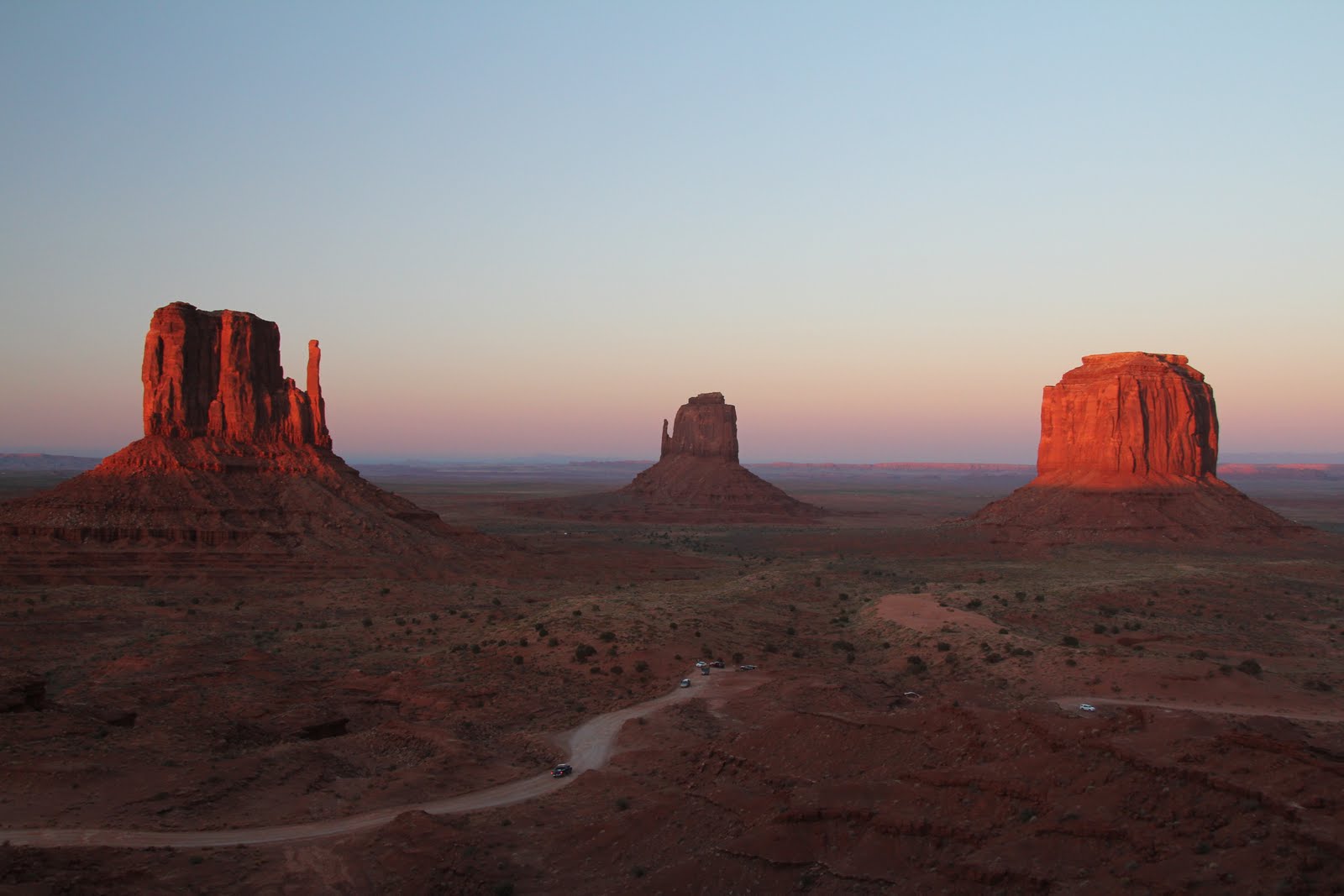 Atrakcí dnešního dne je totiž Monument valley SP. Chvilku hledáme vjezd do návštěvnického centra (u křižovatky je mraky falešných ukazatelů vedoucích do Indiánských krámků). Okruh mezi "filmovými skálami" je po prašné, místy kamenité cestě (11 mil), ale lidé ho jezdí i v ne SUV autech. Poslední fotku dělám se západem slunce. Do Moabu je to podle navigace 4 hodiny cesty. Dáváme to za 3 a půl, ale než nacházíme Lazy Lizard hostel (ubytko v Moabu je pekelně drahé, toto je nejlevnější nestanové bydlení co jde sehnat, ale chce to zamluvit dost dopředu) je půlnoc.
