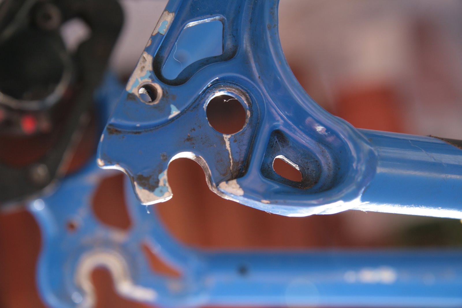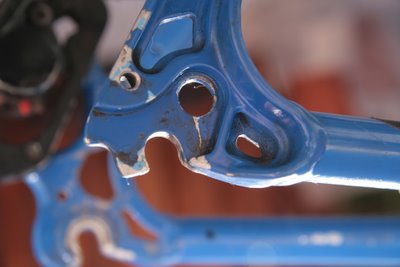 Beru to zgruntu. Roznýtování řetězu jde lehce, stejně tak sundání kazety a přehazovačky. Chvilku koukám na zadní náboj, respektive omačkaný ořech. Po chvilce rozmítání nad novými středy (respektive celými koly) se spokojuji se stávajícími. Váhám, zda mám odmontovat patku a vyčistit bláto, které se pod ní dostalo. Povolit šla snadno, tak ji sundavám. Beru VDéčko a rozpouštím nečistoty. Po setření hadrem koukám na 1,5cm dlouhý "škrábanec", který zbyl pod patkou. Přemýšlím jak se tam vzal. a po chvilce zkoumání zjišťuji že to není úplně tak škrábanec jako prasklý rám.
