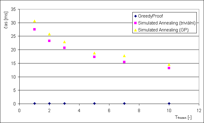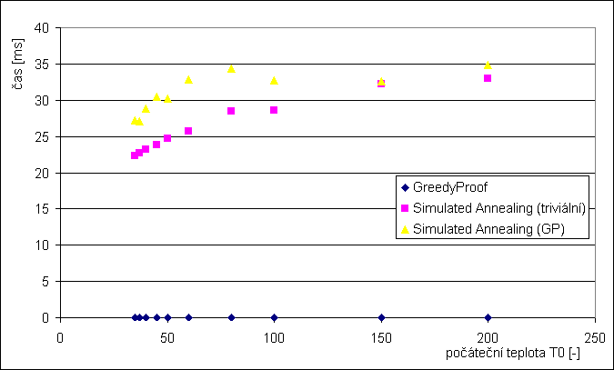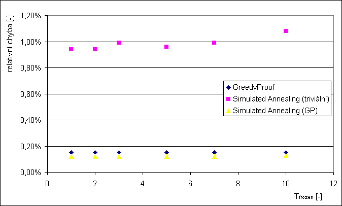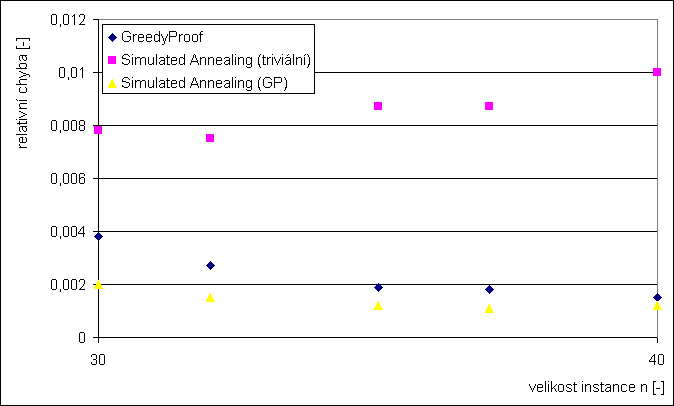 Algoritmus simulovan� ochlazov�n� je pom�rn� snadn� na implementaci. Z experiment� m��eme ��ct, �e je �asov� n�ro�n�j�� ne� hladov� algoritmus a p�i inicializaci trivi�ln� konfiguraci d�v� pr�m�rn� hor�� v�sledky. Pokud inicializujeme SA hodnotou z�skanou GP algoritmem, v pr�m�ru v�dy dojde ke zlep�en� relativn� chyby. Proto�e algoritmus si pomatuje nejlep�� �e�en�, nem��e nikdy vyj�t hor�� v�sledek ne� u GP.U tohoto algoritmu (stejn� jako u dynamick�ho programov�n�) dop�edu zn�me po�et iterac� cyklu, tud� m��eme odhadnout �asovou n�ro�nost. Proto je na prvn� pohled trochu divn�, ��dov� rozd�ln� �as p�i inicializaci trivi�ln�m �e�en�m a �e�en�m dodan�m GP algoritmem. Skryt� �asov� z�vislost je v generov�n� nov�ho stavu. Ten generujeme tak, �e zm�n�me bit na n�hodn� pozici v sou�asn� konfiguraci, ale v�sledn� konfigurace mus� b�t p��pustn�m �e�en�m. Proto pokud vyjdeme z trivi�ln� konfigurace je velk� pravd�podobnost, �e nov� stav vygenerujeme na 1. pokus. U ji� nalezen�ho �e�en� nap�. algoritmem GP opakujeme generov�n� pom�rn� dlouho, ne� dostaneme p��pustnou konfiguraci.