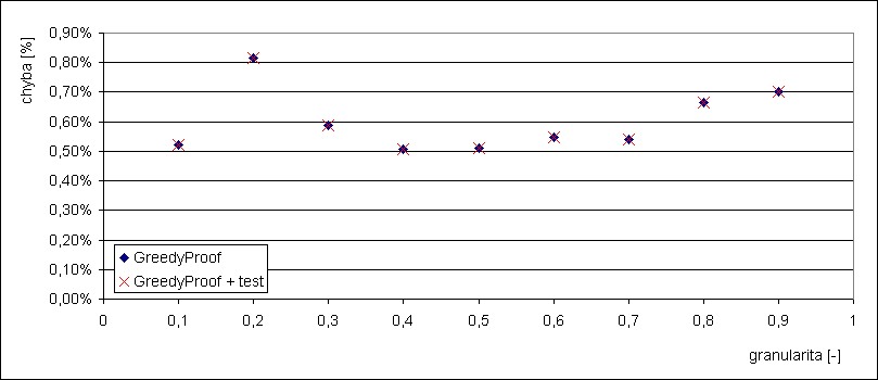 Chyba heuristiky se zmen�uje s rostouc�m pom�rem sum�rn� v�hy ke kapacit� batohu. Naproti tomu o z�vislosti chyby heuristiky na granularit� nem��eme z proveden�ho experimentu nic usoudit, hodnoty jsou t�m�� n�hodn�.